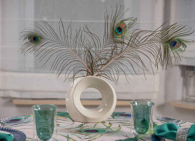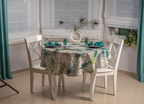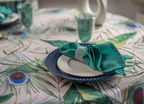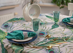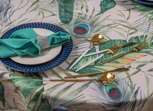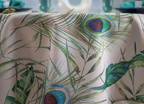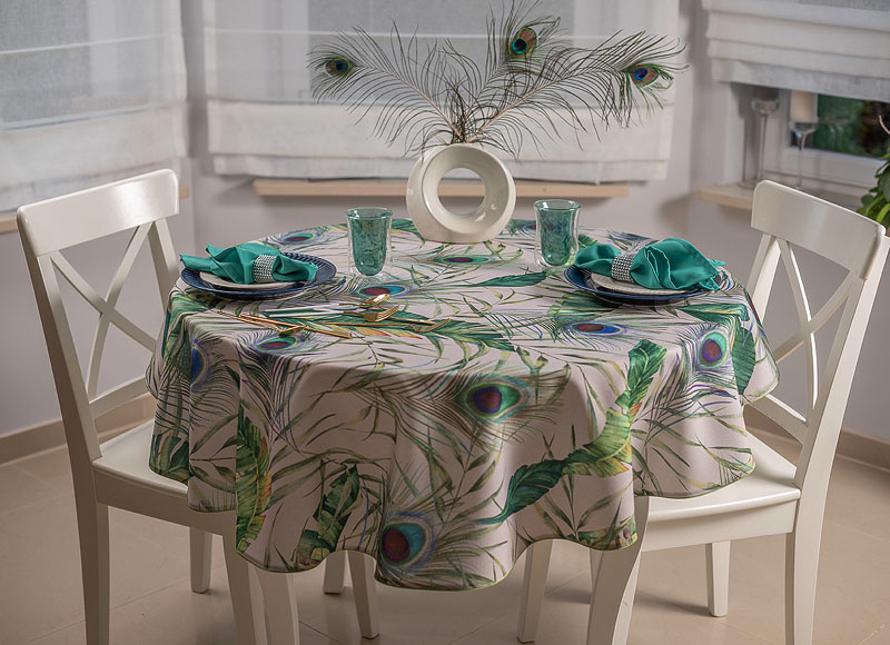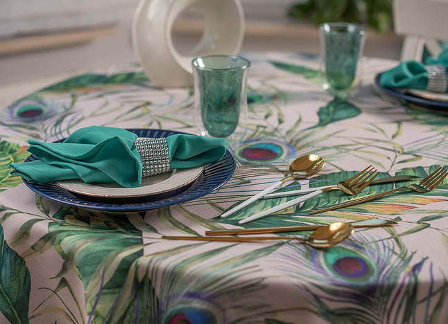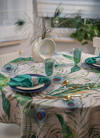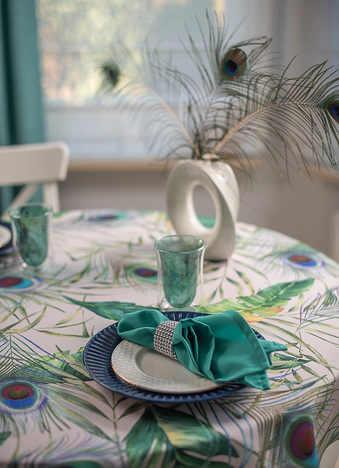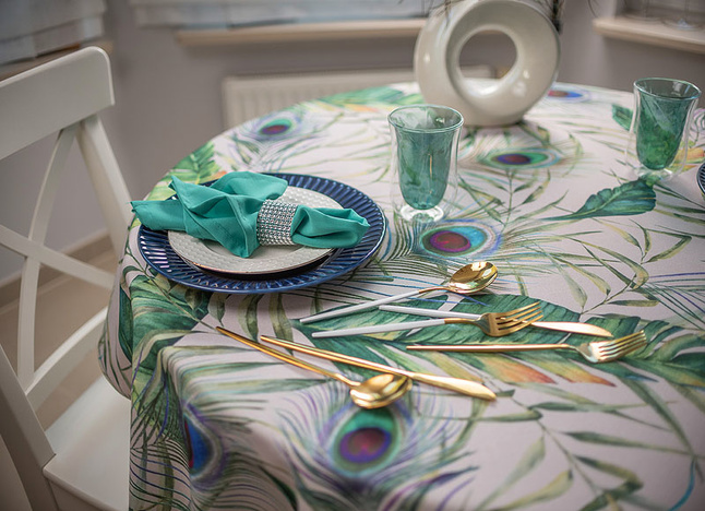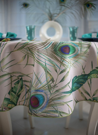 Elegancki plamoodporny obrus z Kolekcji Flowers z delikatnym florystycznym akcentem, w który to wpleciony został motyw kolorowych pawich piór. Ich obecność stanowi przewodni element dekoracyjny i sprawia, iż obrus wygląda nietuzinkowo i oryginalnie. Całość wzoru została wyeksponowana na jasnym beżowym tle. Obrus wykończony jest śliczną zieloną wypustką idealnie pasującą do kolorystyki tkaniny.
