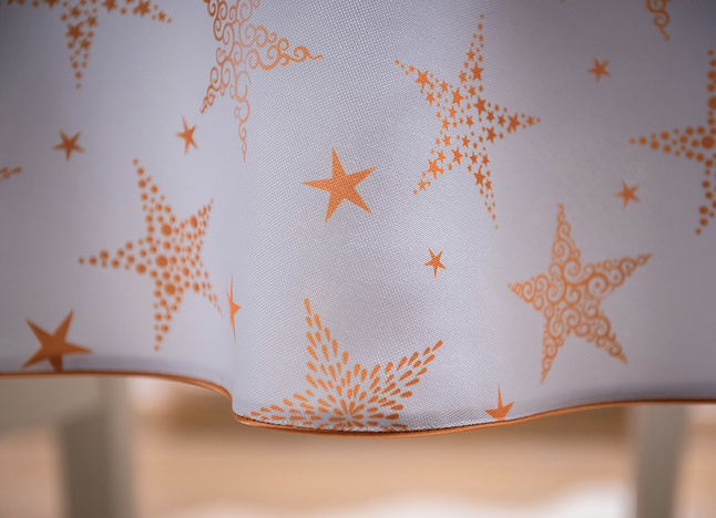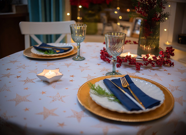 Prostota, elegancja i klasyka – tak najkrócej można opisać obrus Pierwsza Gwiazdka. Na białym tle subtelnie rozświetlają się złote gwiazdy w różnych kształtach i wzorach, tworząc wyjątkowy klimat świątecznej nocy. To właśnie ten minimalizm w połączeniu z ponadczasowym wzorem sprawia, że stół staje się centrum rodzinnych spotkań – pełnym ciepła, tradycji i wyjątkowych chwil.