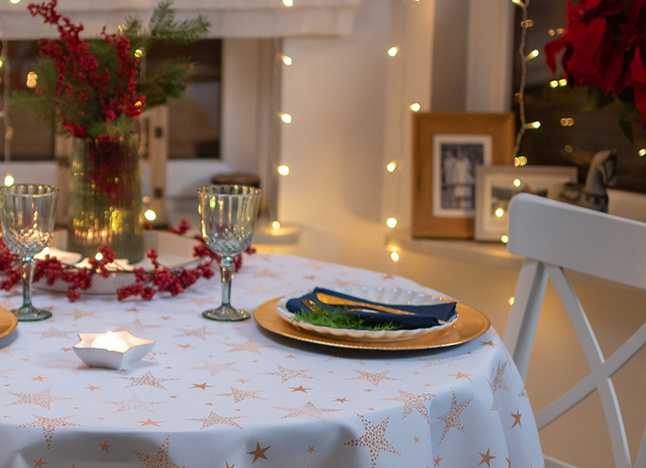 • Prosty, a zarazem elegancki wzór – złote gwiazdy na białym tle podkreślają minimalizm, klasykę i ponadczasowy charakter świątecznej aranżacji.