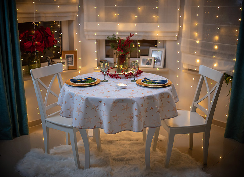 Złote akcenty pięknie odbijają światło świec i choinkowych lampek, zamieniając każdy posiłek w uroczystą celebrację. Obrus Pierwsza Gwiazdka to nie tylko dekoracja stołu, ale także symbol tego najbardziej magicznego momentu – kiedy na niebie pojawia się pierwsza gwiazda i zaczynają się Święta.