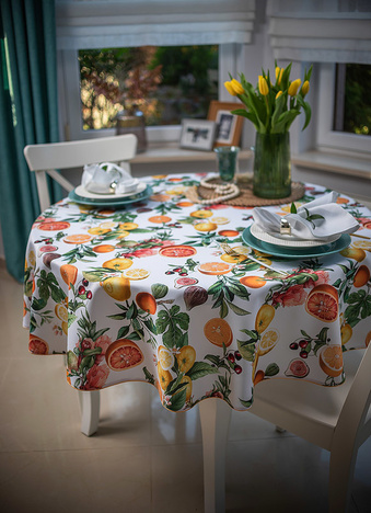Obrus Citrus Fiesta to prawdziwa uczta dla zmysłów – pełna soczystych pomarańczy, cytryn, grejpfrutów, fig i granatów otoczonych bujną zielenią liści i delikatnymi kwiatami cytrusowymi. Jego wzór przenosi nas do ciepłych, śródziemnomorskich ogrodów, gdzie dojrzewające owoce pachną słońcem i radością lata.