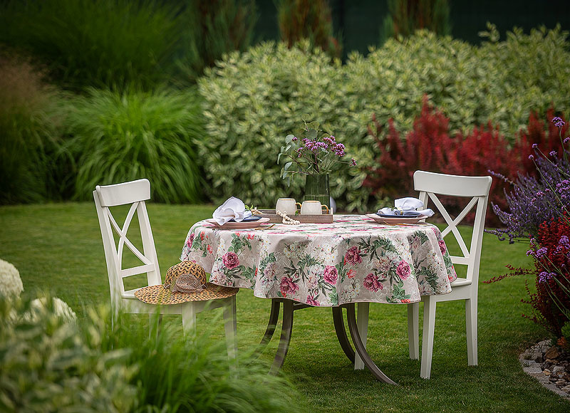 • Łatwa pielęgnacja: Tkanina nie wymaga krochmalenia ani maglowania. Można ją prać w pralce i łatwo wyprasować – nawet po wielu praniach obrus zachowuje intensywność kolorów i właściwości plamoodporne.