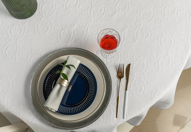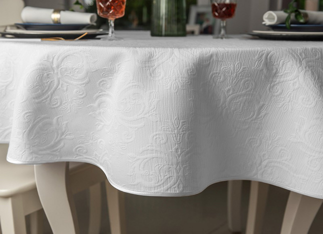 Gruby, tłoczony wzór o bogatej strukturze doda obrusowi wyjątkowego charakteru, nadając mu trójwymiarowy efekt i podkreślając piękno ornamentowych detali (pojedynczy ornament ma wielkość 17cmx17cm).