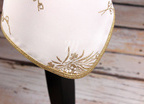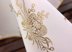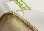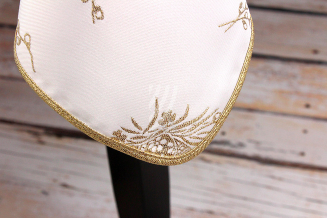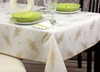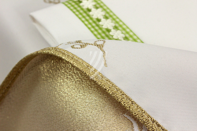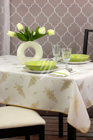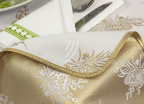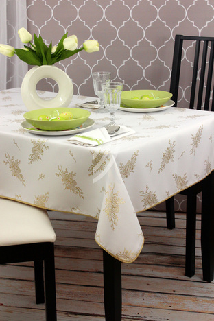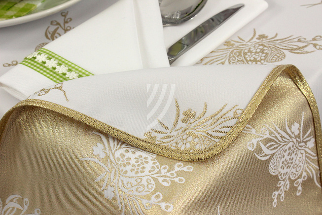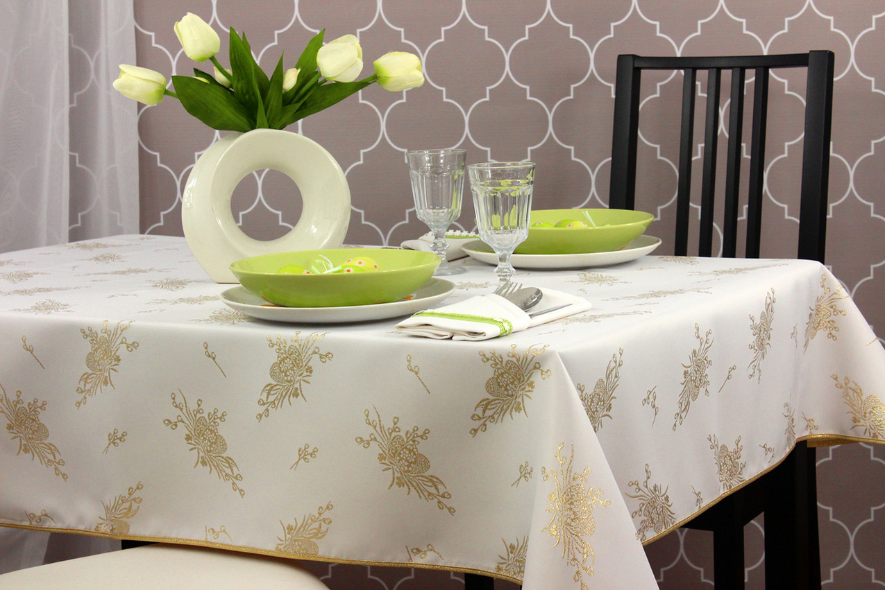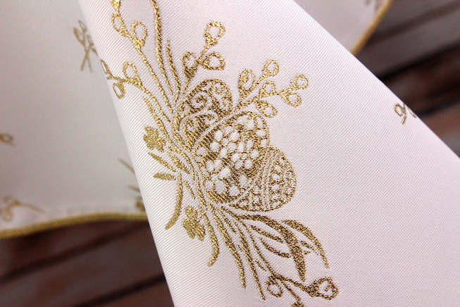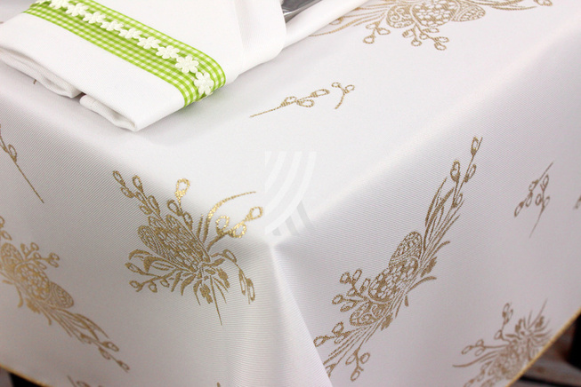 Obrus może mieć dwustronny charakter. Prawa strona prezentuje złoty wielkanocny wzór na białym tle, a lewa białe wzory na złoto-brokatowym tle.
